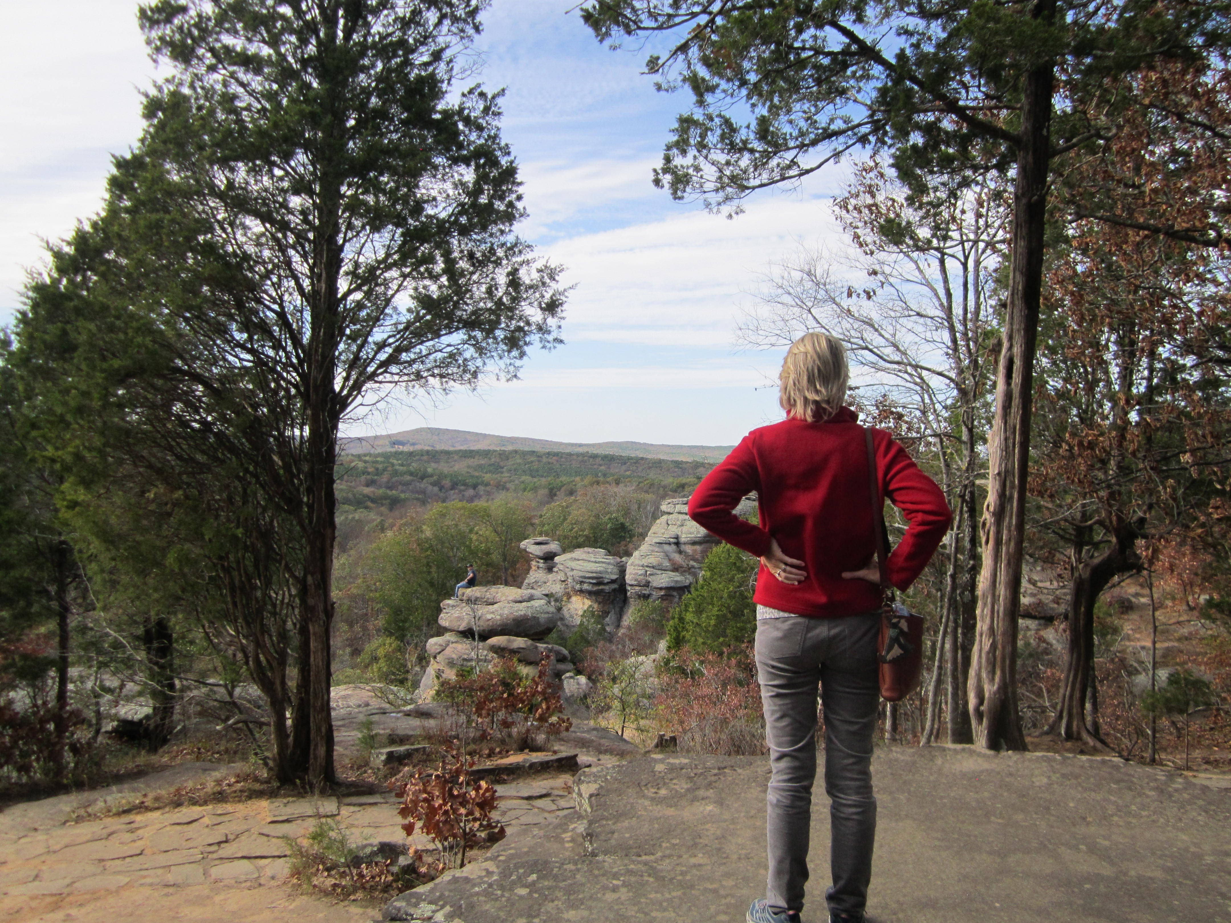 Garden of the Gods and Rim Rock/Pounds Hollow Recreational area are two must see locations on the eastern side of the Shawnee National Forest. Both are located just off Karbers Ridge blacktop 30 minutes from Harrisburg. Garden of the Gods consists of spectacular overlooks and views of unusual rock formations. One formation, known as Camel Rock, is featured in the America the Beautiful Quarter Program representing Illinois and came out in 2016. Garden of the Gods has been listed in “USA Today” as one of “Ten Great Places to Get Nature on Film”. There are two main trail systems. The “Observation Trail” is a .25 mile stone path featuring some of the most well known formations. The view of the 3300 acres of beautiful old growth forest from this trail is breathtaking. Sunsets are especially beautiful. The Wilderness area is over 320 million years old. The sediment rock in this area is over 4 miles deep and the fractured bedrock has created some interesting rock formations that represent various objects. There are other trails which interconnect for plenty of hiking. For those people who want even more extensive hiking River to River Trail enters the east end of the area from High Knob and proceeds south below the rock formations before bearing west again. River to River Trail is a trail system which stretches across Illinois from the Ohio River to the Mississippi. Rim Rock/Pounds Hollow Recreational area consists of a wonderful scenic trail of exceptional beauty and historic values. The trail leads past remnants of a stone wall built by prehistoric Native Americans, an observation platform and steps descending through huge rock formations, narrow rock passageways via stone steps to the floor below. Ox Lot Cave, at the bottom, is a massive rock overhang where 19th century loggers kept their oxen and horses. Continue hiking to the beautiful 28 acre forest lake known as Pounds Hollow Lake, or through massive sandstone canyons back to the top of the escarpment. The upper trail is paved and less strenuous for hikers. The lower trail has a dirt surface and leads along the base of the bluffs before looping back to the parking lot.