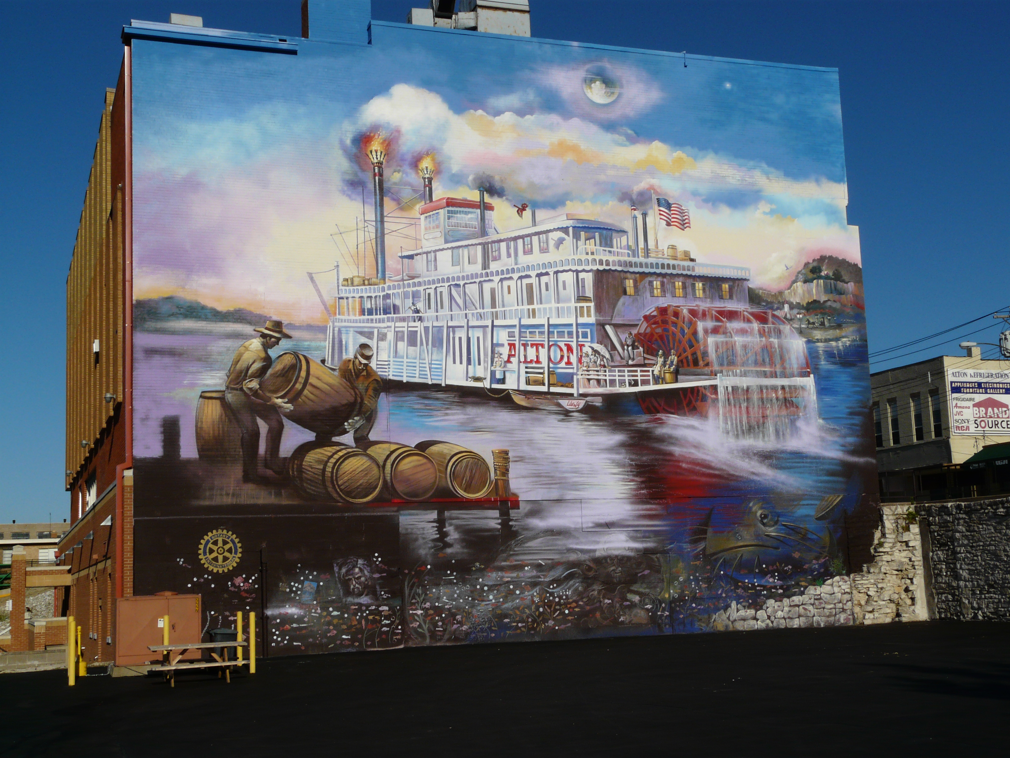 Sailing down the mighty Mississippi River in Alton is a paddlewheel steamboat bearing the city’s name. Except the boat isn’t actually on the river. Instead, it is an outdoor mural soaring five stories high on the Riverbend Head Start & Family Services building, located on Landmarks Blvd. near the city riverfront. The mural is a nod to Alton’s historic past as a thriving river community which, at one time, rivaled nearby St. Louis as an important river port. The mural greets visitors to the city as they cross the Clark Bridge from Missouri.
